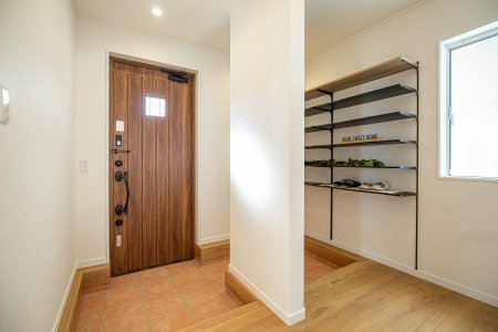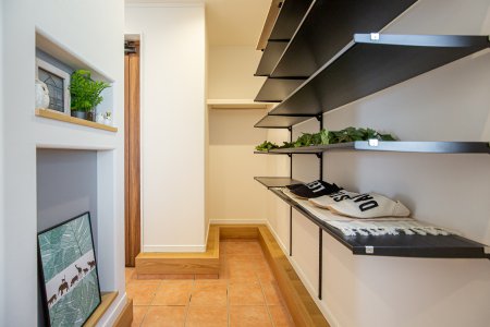 ボックス型の玄関収納ではなくシューズクロークにすることで「魅せる収納」に。意外と収納場所に困ることの多い雪かきの道具も土間収納があれば安心!