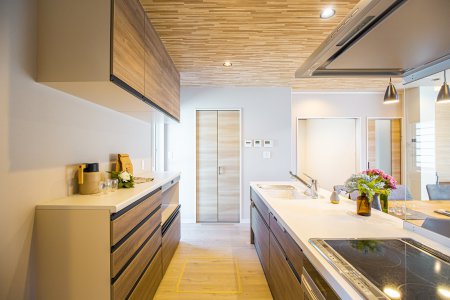 IHクッキングヒーターでお手入れが簡単。キッチン傍にパントリーを設ける事で食料品や飲料などを備蓄しておく事ができます。