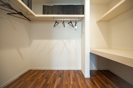 主寝室のウォークインクローゼットはハンガーパイプの他、枕棚や中棚を設置しているのでお布団などもしっかり収納できます。