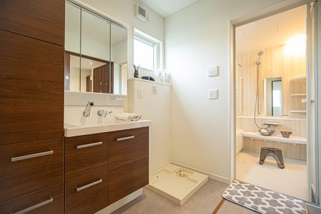 三面鏡の裏は収納スペースとなっており、物が多くなりがちな洗面台まわりをスッキリ保つことができます。
