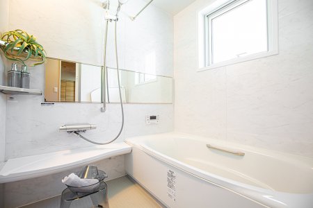 全体をホワイトでまとめた清潔感のある浴室です。美しく機能的なデザインと安全面も考慮され、1日の疲れを癒すほっと一息つける空間です。