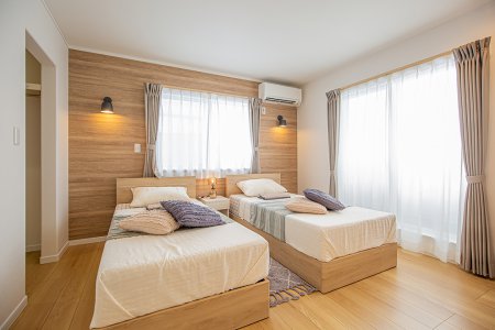 主寝室は一面に木目のクロスを採用。ダウンライトと間接照明で落ち着きのある雰囲気です。3帖のウォークインクロゼットはお洋服やお荷物の多い方でも安心の広さです。