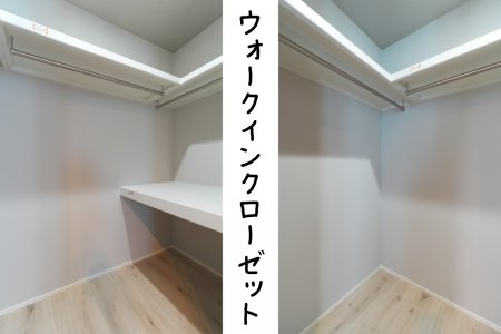 主寝室のウォークインクローゼットはハンガーパイプだけでなく腰高さの棚も付いているのでお布団も収納可能です◎