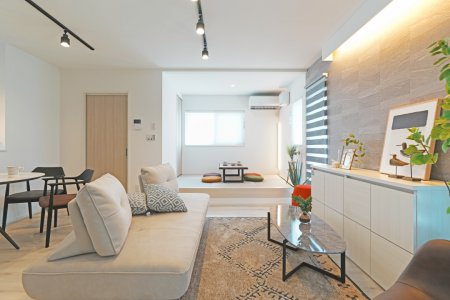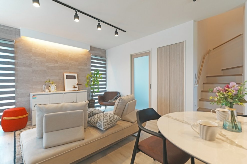 LDKは間接照明とこだわりの壁紙がアクセントの温かみのある明るいデザインです。また、玄関や水まわり、階段にも直接アクセスできるので無駄な動線のないすっきりした設計です。
