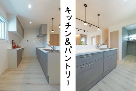 キッチンは流行のグレーカラー。お手入れしやすく汚れにくい工夫がされています。また、収納も観音開きではなくスライド式でたっぷり収納が可能。キッチン奥にはパントリーも!