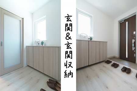 おうちの”顔”になる玄関は白基調の窓ありで明るく清潔感のあるデザインです。玄関収納はカウンタータイプ採用で鍵やマスクなど外出の際に必要なものやお気に入りのインテリアを飾ることもできます。