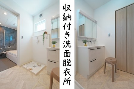 洗面脱衣所には収納付き!タオルや洗剤の買い置きなどを収納しておくのに便利なちょっとあると嬉しいスペースです。