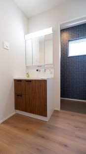 洗面化粧台は三面鏡タイプを採用。朝の身支度も完ぺきに!?また、脱衣所と分けた設計なので家族の誰かが入浴中でも気を遣うことなく洗面スペースを使用できます。