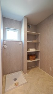 脱衣所スペースは2帖の設計です。収納付きでタオルや下着、買い置きの洗剤などをここにしまうことができます。