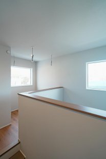 1階の吹抜けは2階ホールに繋がっています。2階ホールは明るく陽の光のたっぷり入る空間なので物干しスペースを設けています。