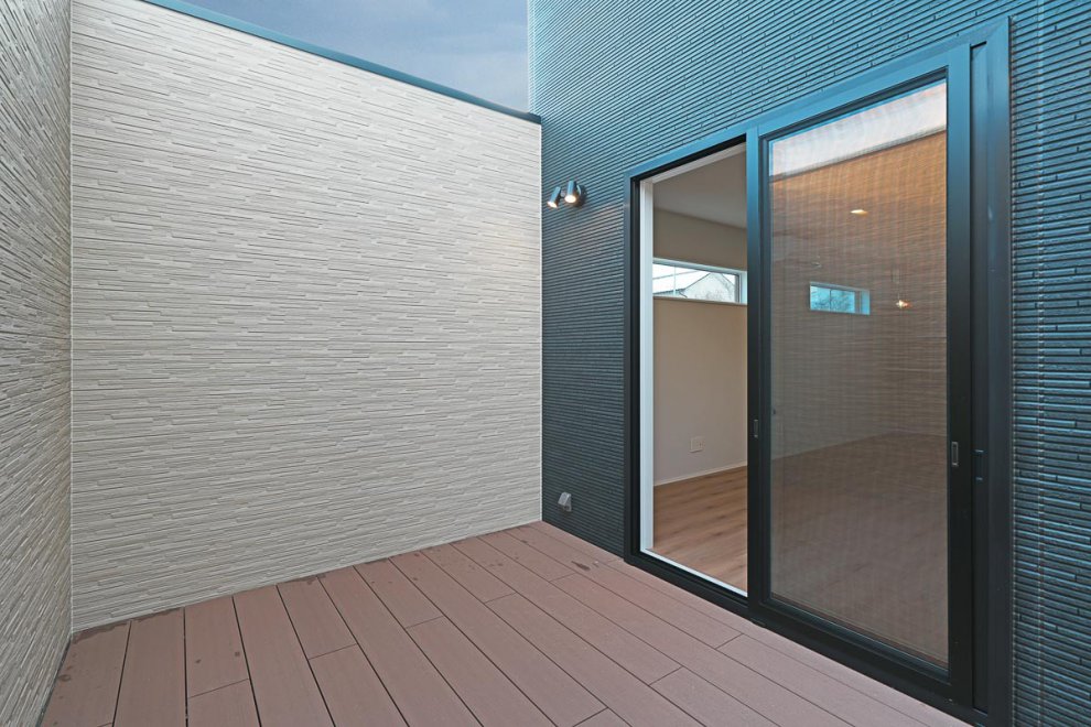 外観はブラックとブラウンがメインの重厚感のあるデザイン。ホワイトの外壁で囲まれた部分が半屋内外スペースの“ロジア”です。