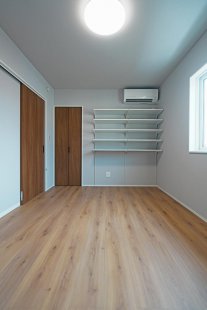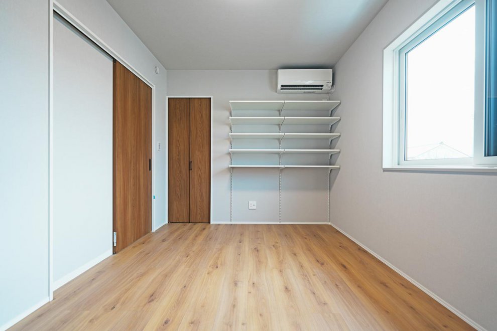主寝室は6.7帖の設計。寝室内に可動式の棚収納を設けているのでよく使うものなどをサッと収納できます。