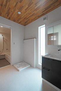 洗面脱衣所は広めの3帖の設計。縦長の窓を設け居ているので、日中は陽の光が入り照明を付けなくても良い明るさです。