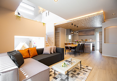 LDKはオープンキッチン&吹抜け&スキップフロアで家族の気配を感じられるコミュニケーションの取りやすい空間です。