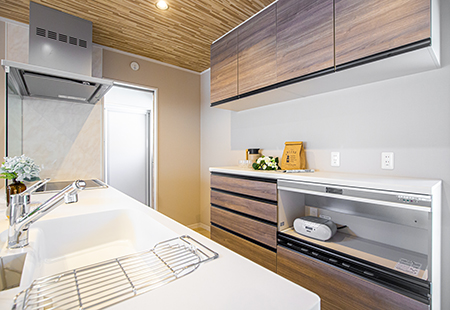 汚れにくくお掃除しやすい換気フード「よごれんフード」や食洗器、IHを完備しているので家事がグッと楽になります。また、オープンキッチンなのでお料理しながら家族との会話も弾みます♪