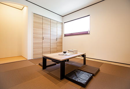 2色使いのタタミでナチュラルシックにまとめた和室はホッと一息つける安らぎの空間です。客間として、お子様の遊ぶスペースとして、お昼寝スペースとして様々な使い方ができます。
