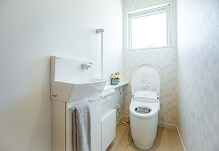 手洗い器には収納も付属しているのでトイレットペーパーや掃除道具などをすっきり収納することができます。