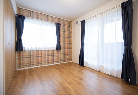 チェック柄アクセントクロスの可愛い洋室はお子様のお部屋にいかがですか?