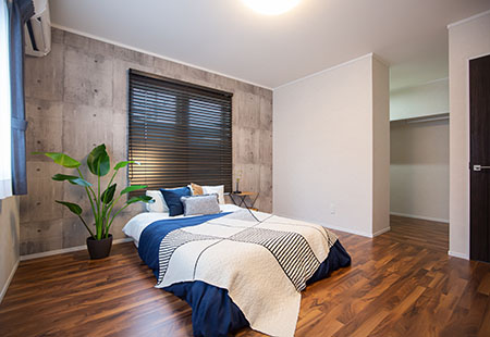 コンクリート調のアクセントクロスと寒色系インテリアで格好良くくつろぎ主寝室に!