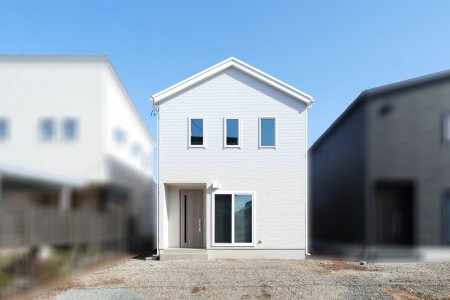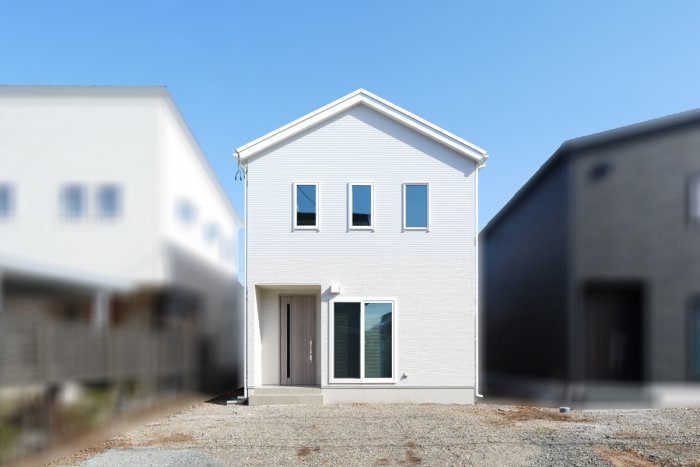 外観は明るく清潔感のあるデザイン!ホワイト基調に玄関ドアのグレージュカラーが映えます。