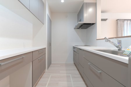 キッチンは食洗器付きなので毎日の家事がラクに!キッチン収納は造り付けなので地震が起きても倒れてくる心配が少ないのが嬉しいポイント。食器棚の他にパントリーも完備で買い置きの食品や飲料もたっぷり収納!