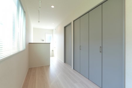 2階ホールスペースはたっぷり1帖分の収納と室内物干しスペースを完備。1階のランドリールームで干しきれない洗濯物もここで乾かすことができます。洗濯物の多く出るご家族も安心の設計です。