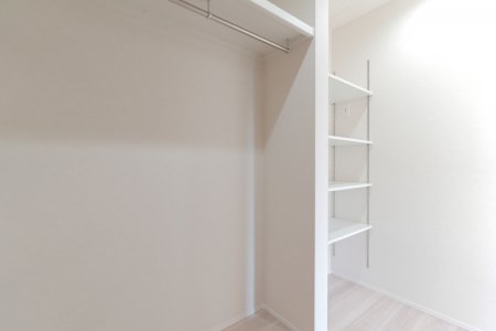 主寝室のウォークインクローゼットはハンガーパイプだけでなく可動式の収納棚もあるのでボックス収納などを使うと小物などもすっきりと収納することができます。