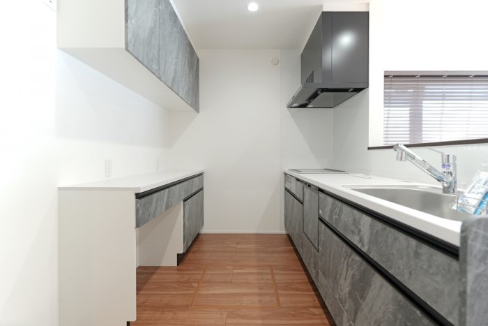 キッチンは食洗器付きで毎日の家事の時間を減らすことができます。キッチンと同様のカラーの食器棚は造り付けのため、地震の際にも倒れてくる心配が少ないのがポイントです。