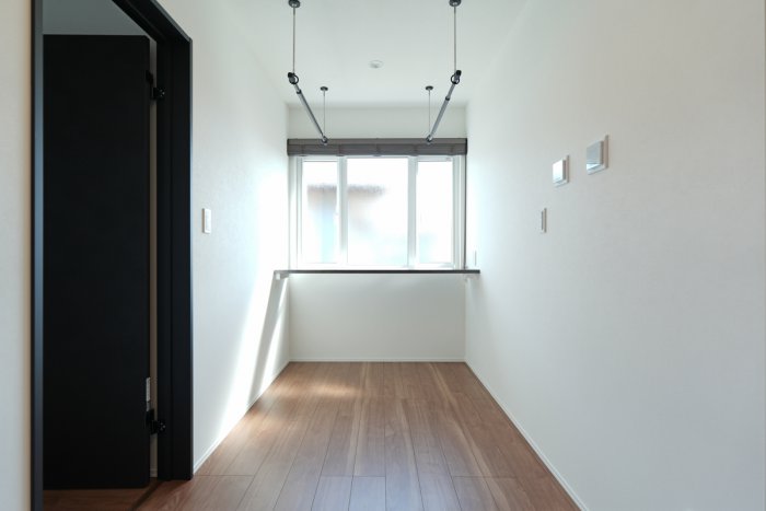2階ホールには物干しスペースも設けています。雨の日や花粉の飛散する日も安心してお洗濯物を干すことができます。
