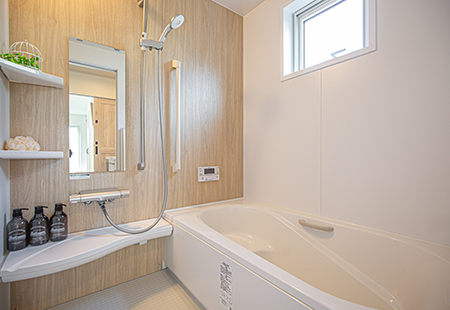 1日の疲れを癒す浴室に木目調のアクセントを入れる事で優しい空間に仕上がります。