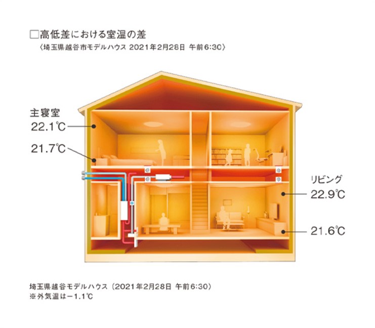 高断熱・全館空調の家は、外の寒さや暑さを家の中に持ち込まないだけでなく、部屋の上下の温度差も少なく、部屋間の温度差も少ない、快適な空間を実現できます。昔の家のように暖かいリビングを一歩出ると、エアコンの暖気が届かない廊下や洗面所、トイレは寒くて震えてしまったり、夜中トイレに行くのが寒くてイヤ、といった心配は無用。急激な温度変化による身体への負担も軽減されます。