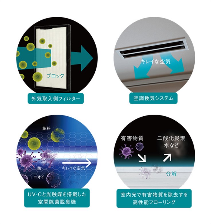 バイオメディカルサイエンス研究会理事長瀬島俊介氏の監修のもと、「すごい家」の標準仕様モデルハウスで実験を進めた結果、優れた換気・除菌・脱臭性能が実証されました。窓を開けずにいても、1時間内にCO2が ピーク時の半分以下に高い気密性と空調換気システムで効率よく換気し、除菌・脱臭装置の性能に加え 光触媒フローリングの効果で 1時間で大幅に除菌します。不快な臭いも短時間で 感じないレベルに。