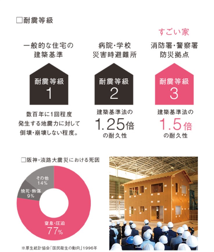 内閣府の世論調査によると、大地震が起こったとしたら心配なことの第1位は「建物の倒壊」。すごい家が基準にしているのは、「耐震等級3」の設計。
