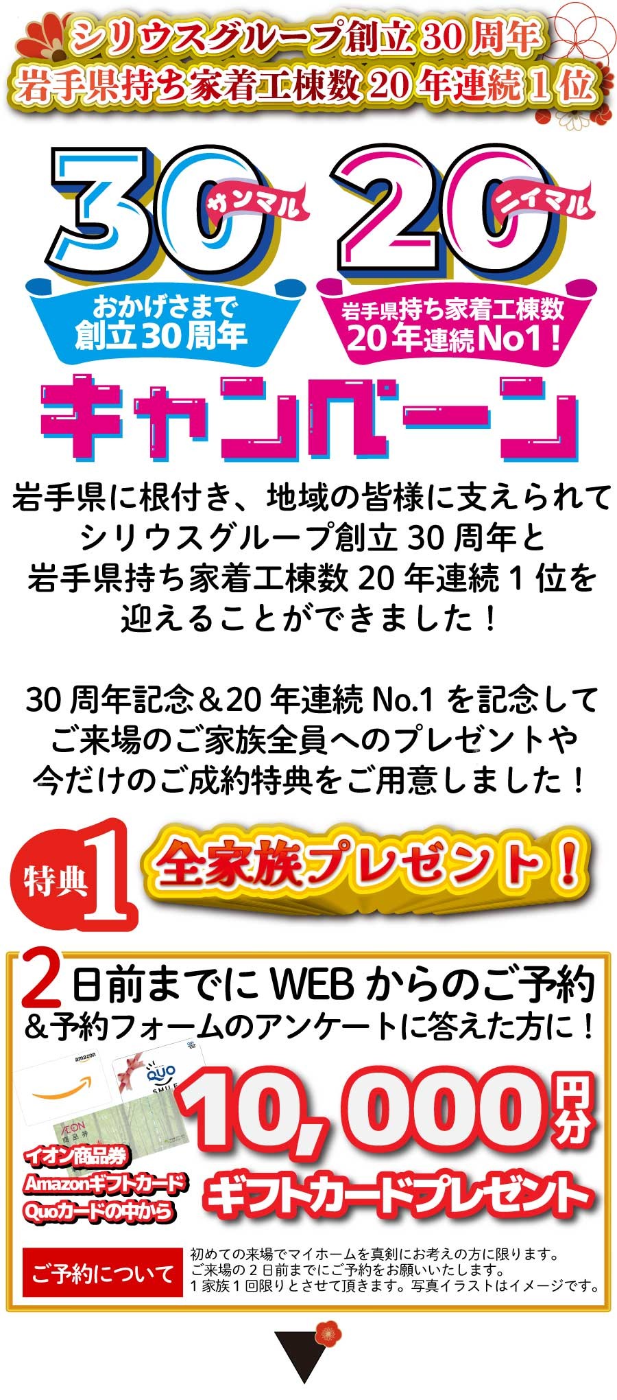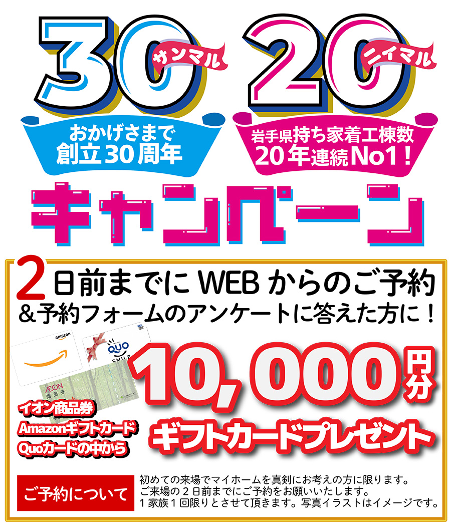 【新築住宅】好評につき第2弾!おかげさまで創立30周年!持ち家着工棟数20年連続1位達成記念キャンペーン【盛岡北店】