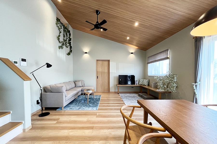 20帖の広々LDKは勾配天井で開放感があり