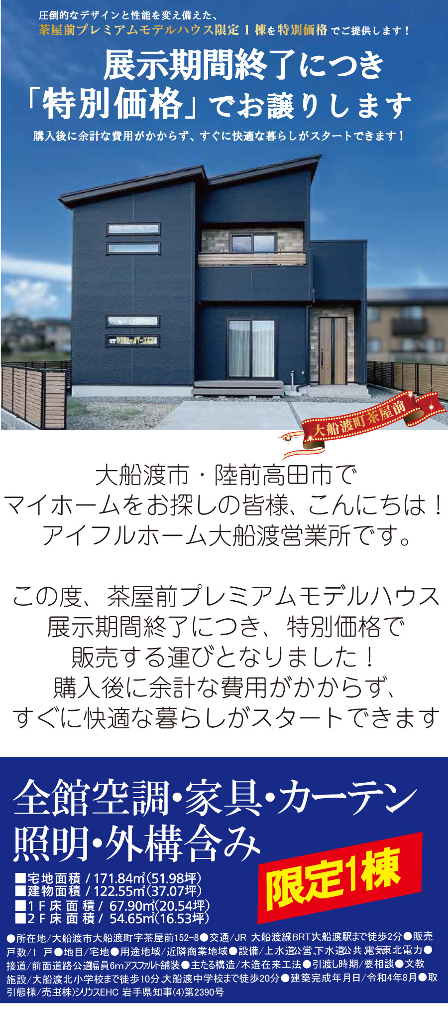 【予約制】茶屋前プレミアムモデルハウス「特別価格」でお譲りします【大船渡営業所】