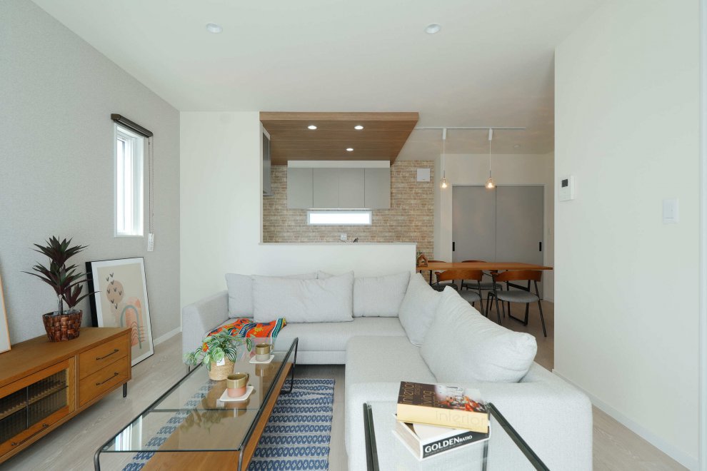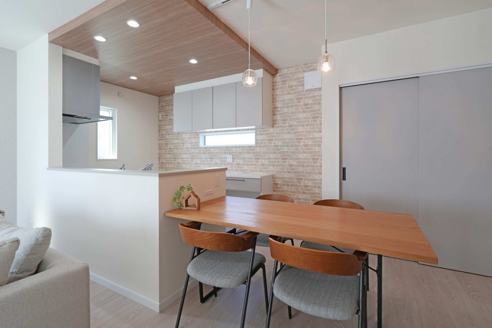 明るさとデザイン性を兼ね備えたLDK。木目やレンガ調のアクセントが上質さをプラスし、家族の時間を豊かに彩る快適な住まいの中心となります。