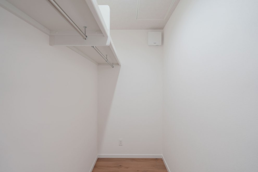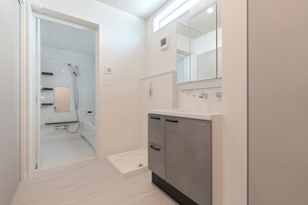 明るい光が差し込む清潔感あふれる洗面脱衣室。収納や家事動線にも配慮され、洗濯や身支度がスムーズに行える快適な空間です。