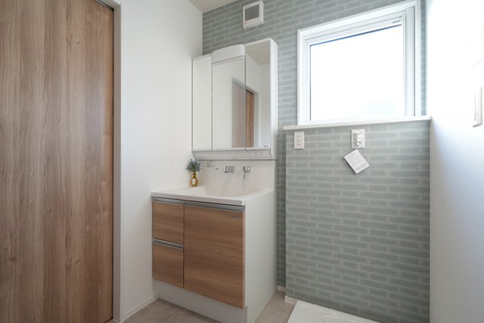 青いタイルと木目がかわいく調和した洗面脱衣室。毎朝ここから始まるのが、ちょっと楽しみになる空間。