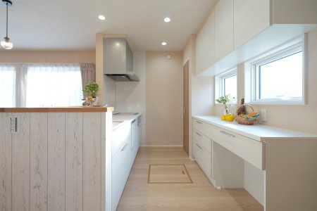 白を基調とした明るいキッチン。大きな窓から光が差し込み、毎日の料理がもっと楽しくなる空間です。