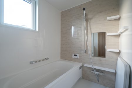 白と木目のやさしいコントラストが心地よい浴室。明るくて清潔感があり、1日の疲れをふわっと癒す空間に。