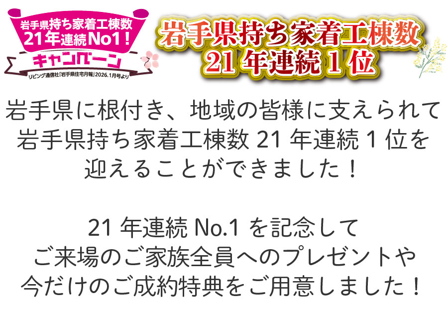 【新築住宅】おかげさまで創立30周年!持ち家着工棟数21年連続1位達成記念キャンペーン【北上中央店】